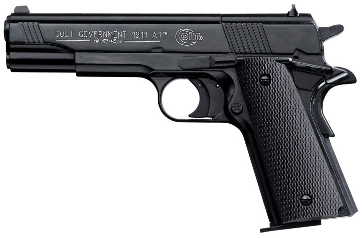 This is a colt goverment 1911 gas powered pistol it has a nice feel to it with plastic and metal parts, the gas goes in the grip puncturing it with the lever at the bottom, you have two ways of firing either pulling back the hammer every time or fire off one after the other with no interuptions this take 6 pellets at a time. there is a saftey feature which is pushing in the lever on the grip to allow firing.