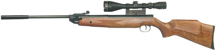 This is a 22. air rifle it does not have gas it has a break barrel motion, it comes with a preset telescope, it has a nice wooden structure with metal barrel and functions.